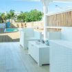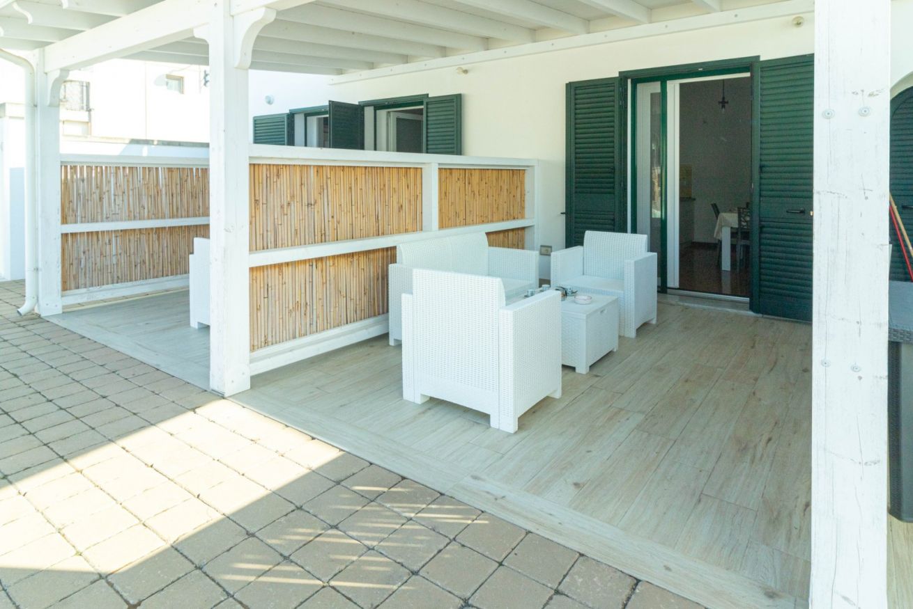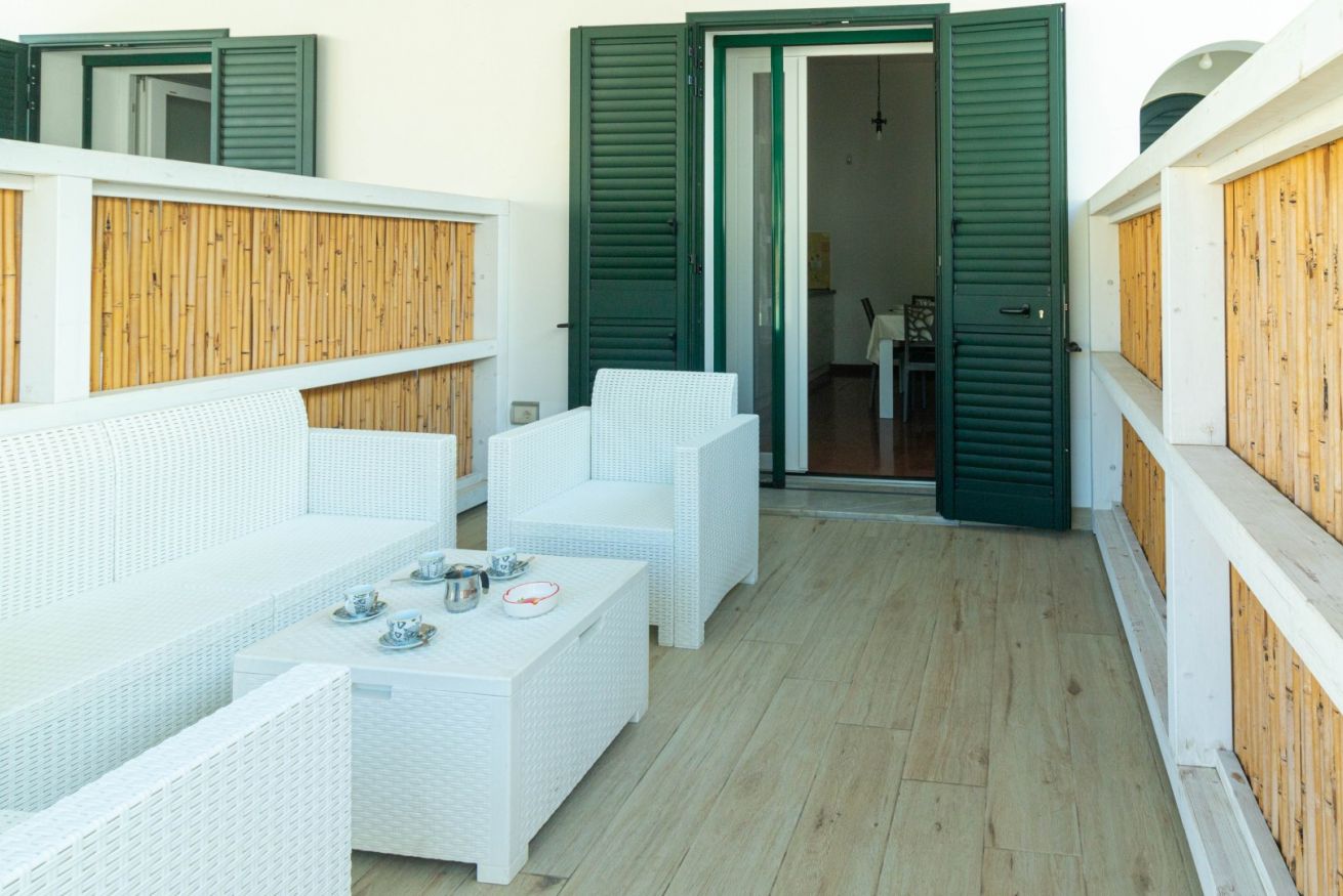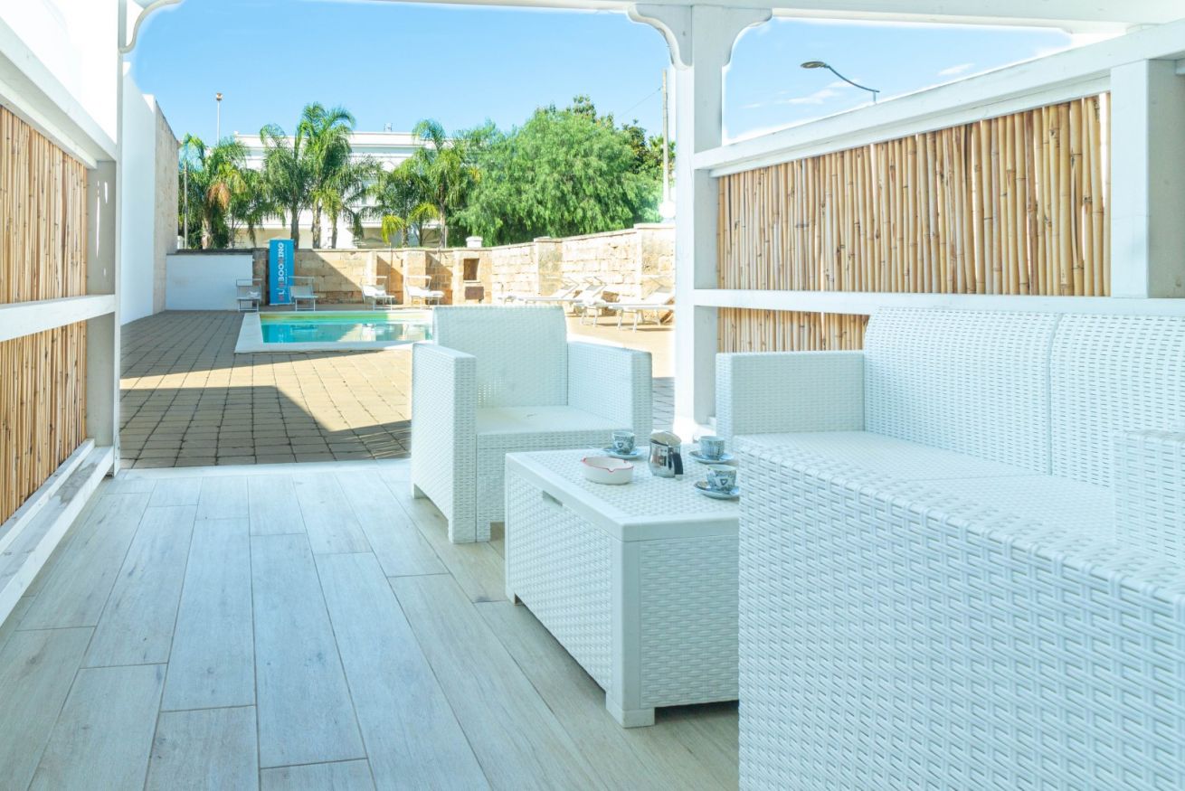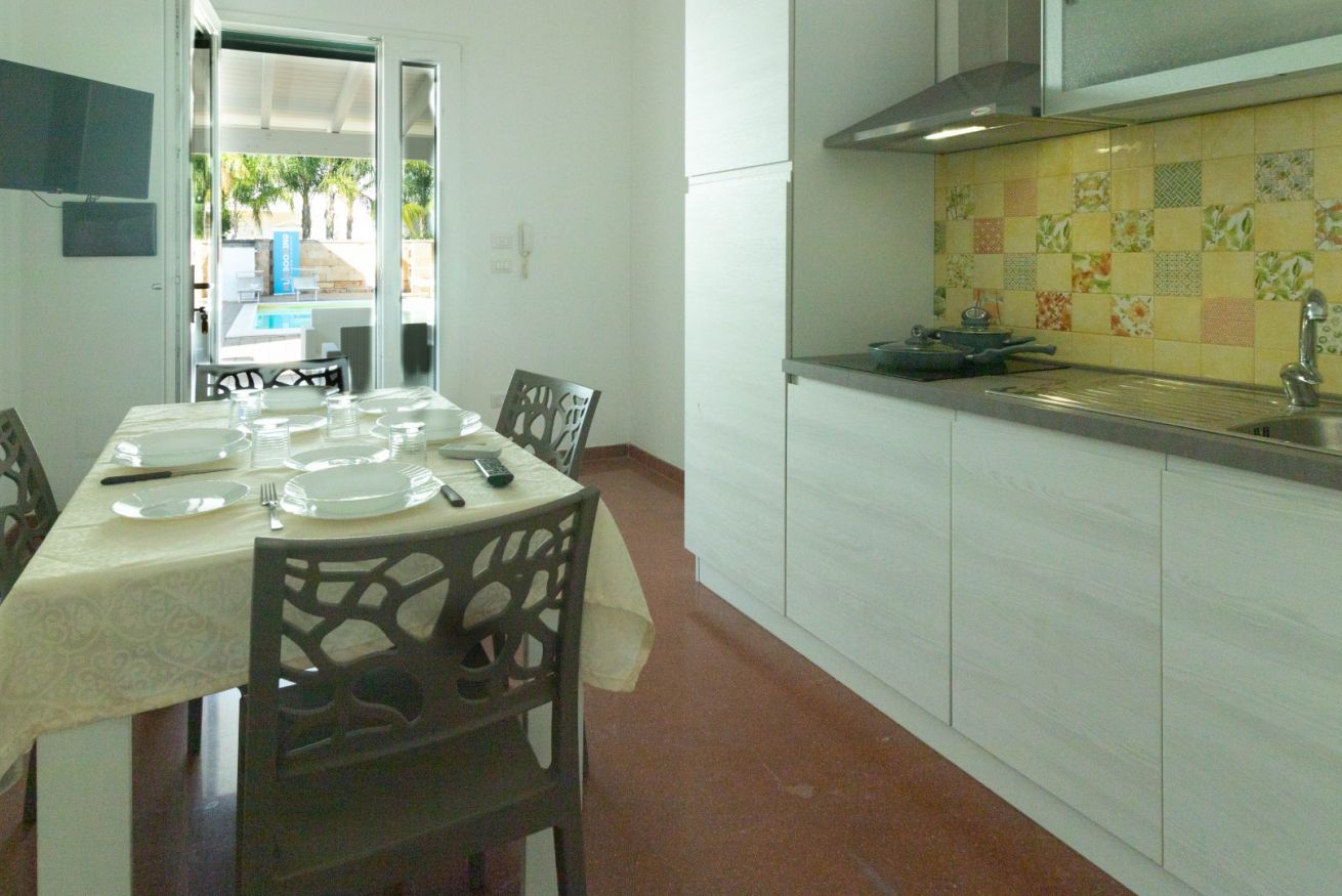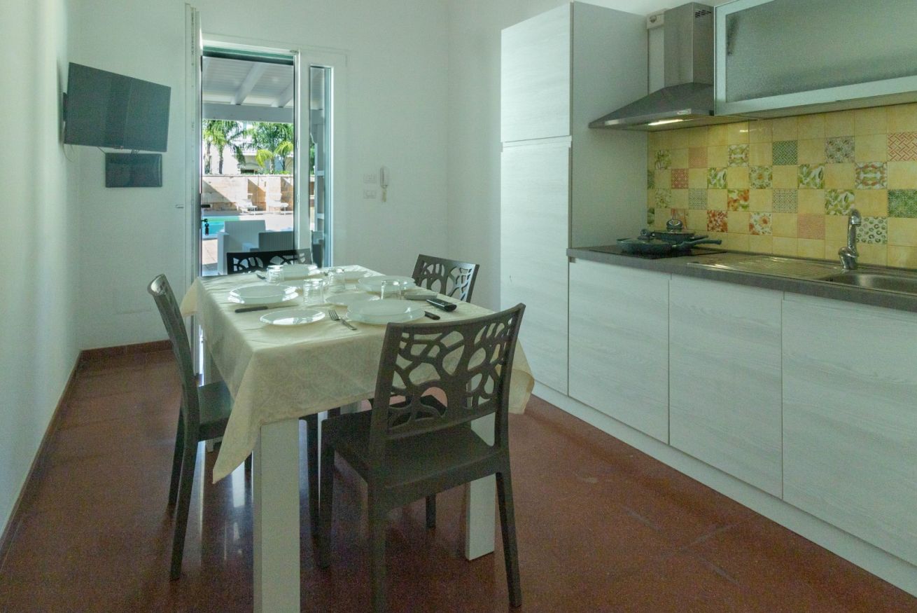 L’Appartamento Sonata dispone di un porticato esterno arredato con divani relax, ideale per momenti di svago all’aperto, colazioni o aperitivi serali con vista sulla piscina. All’interno, la cucina abitabile completamente attrezzata include piano cottura a induzione, frigorifero con freezer, macchina del caffè e zona pranzo, perfetta per preparare pasti in autonomia e condividere momenti conviviali con amici o familiari.