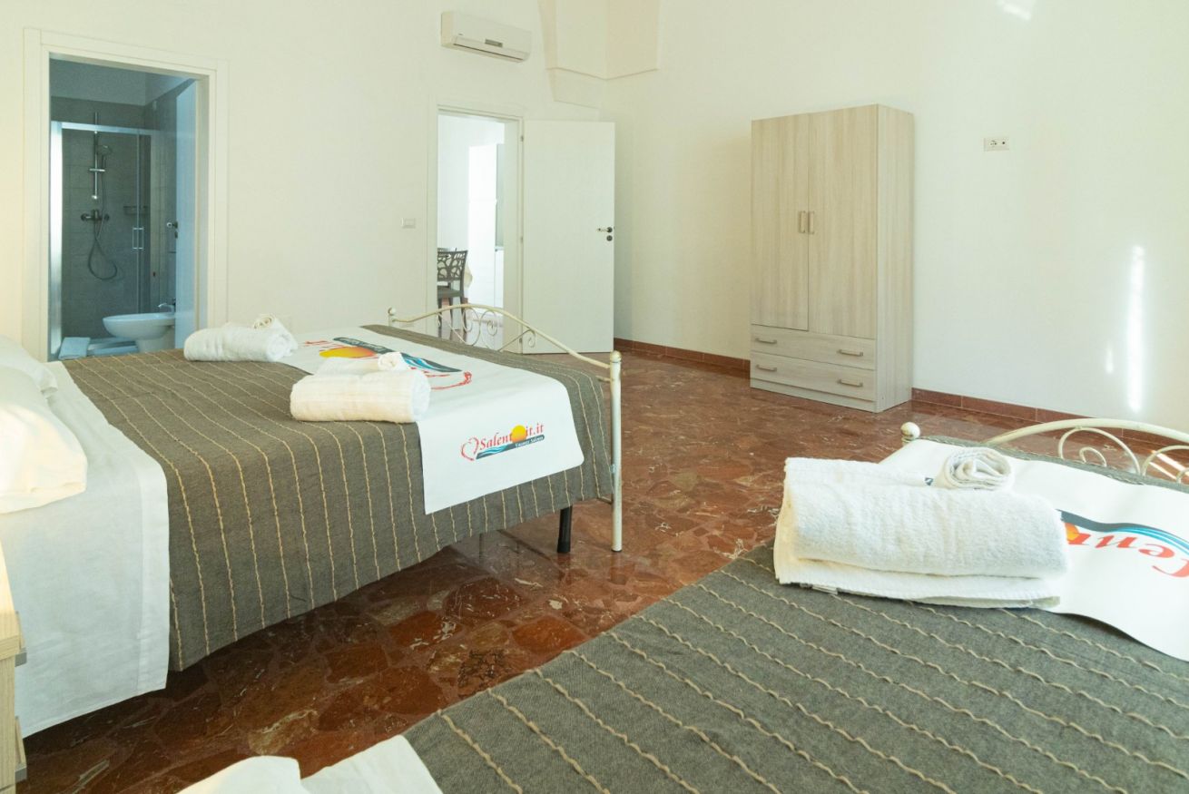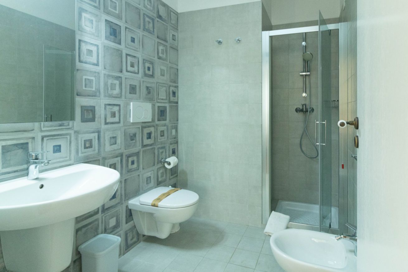 La camera da letto tripla è composta da letto matrimoniale e letto singolo, adatta a famiglie o piccoli gruppi. Il bagno moderno è completo di box doccia, lavabo, bidet e WC, assicurando comfort e praticità durante il soggiorno. Tra i servizi aggiuntivi, aria condizionata, TV a schermo piatto e Wi-Fi gratuito completano l’esperienza.